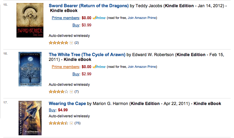 In other words, say you’ve got a $0.99 book at #10 on the Epic Fantasy list. (Popularity list, not bestseller.) Say its sales rank (bestseller list) is #1000. The books at #9 and #11, meanwhile, are both listed at $9.99–and their sales ranks will probably look more like #3000, say.