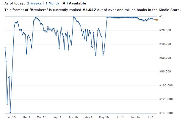 What caused the rebound? Borrows are a big part of it. Breakers has been listed at #1 in Science Fiction in the Kindle Online Lending Library for at least a week now. Despite the top placement in its genre, in the last four days of May, Breakers had 37 borrows, averaging 9.25/day. In the first four days of June, it’s had 110–27.5/day. Clearly, most Prime members had exhausted their monthly borrows by the end of the month; as their borrow refreshed June 1, many new readers snapped up the book.