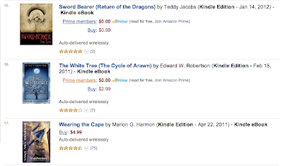 What does that mean in practice? A lot. A lot a lot a lot. Here’s where my book The White Tree ranks on all three lists at this moment in time. Each shot will look a bit different because they’re taken from different browsers–that’s one way to see different lists. The list in question is Fiction > Fantasy > Series, a fairly quiet little fantasy subcategory.